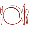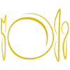 Logo for Caffe Pacific Catering with a plate, fork, and knife in white on a black background.
