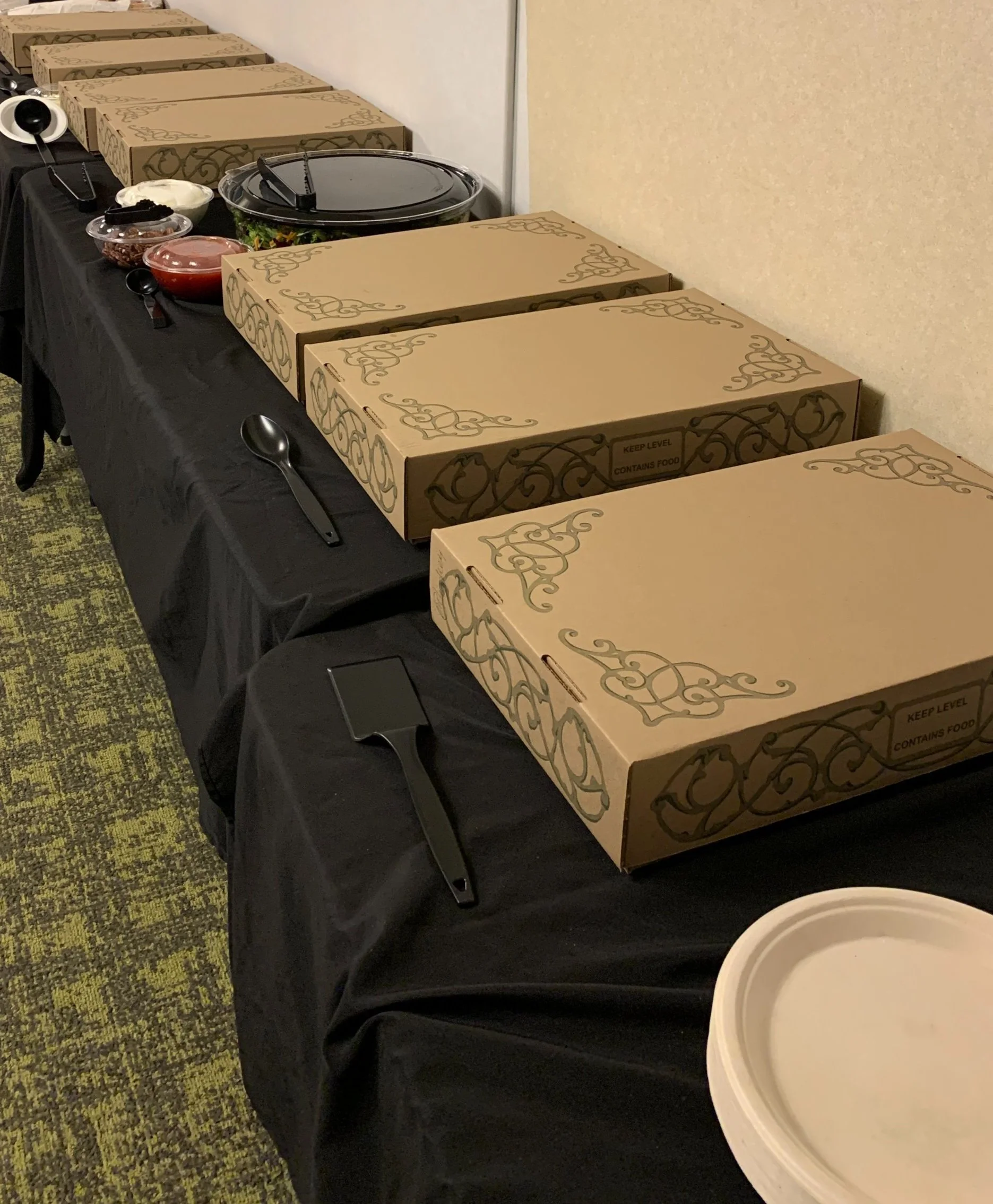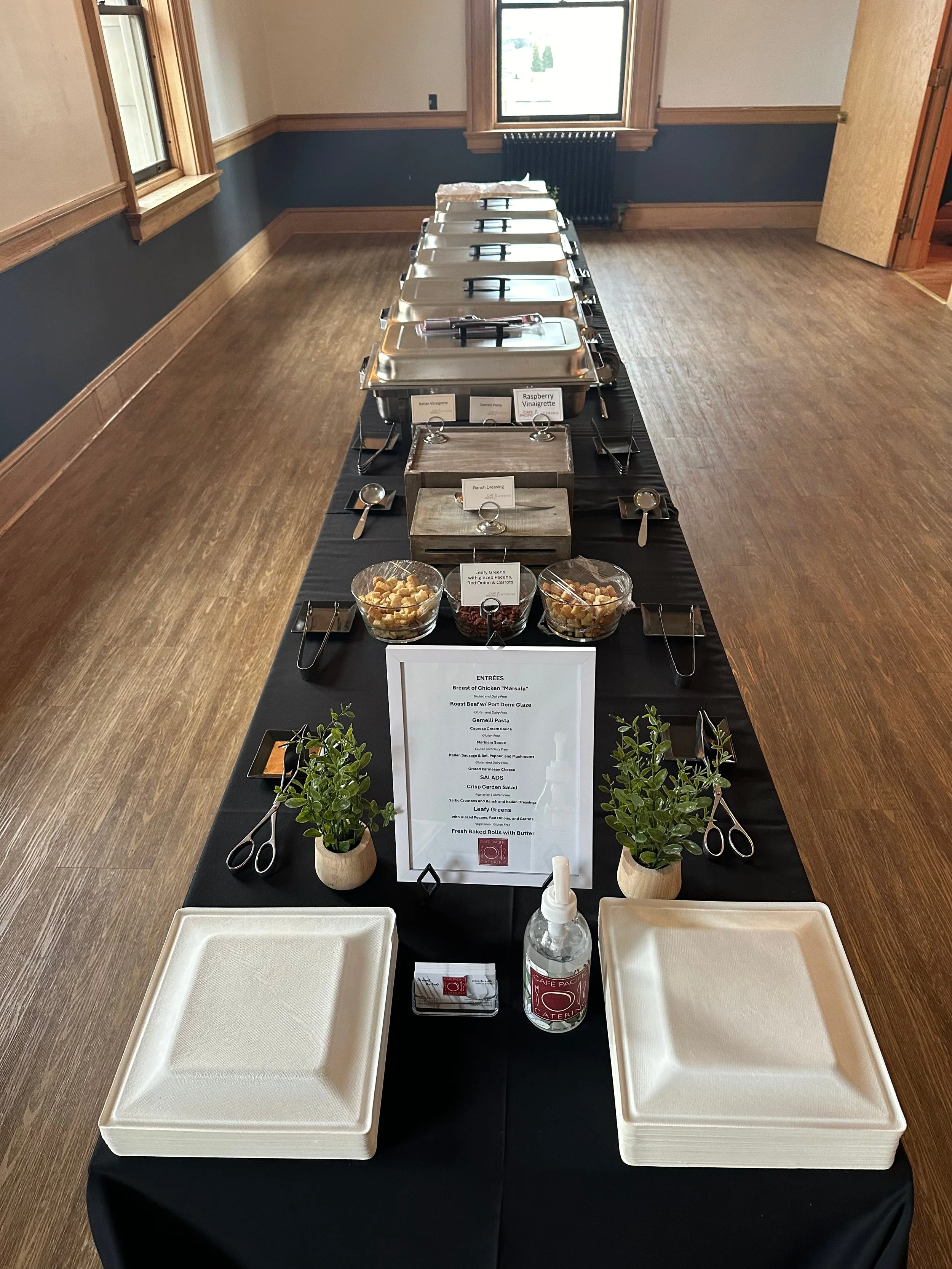 • Our full-service buffet experience includes everything you need for a seamless meal service. We provide high-quality menu items, buffet tables, linens, serving equipment, and disposable plates, flatware, and napkins. Our team handles the setup and breakdown of the buffet, ensuring your event runs smoothly. Staff labor for serving, replenishing, and clearing the buffet is available as an additional service.